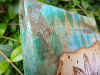 I layered in some stamping - using stamps from Insects and Butterflies, Botanical Plate #1 (both in Coffee Archival) and Calligraphic Mat #4 (in Broken China DI).