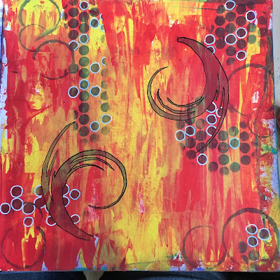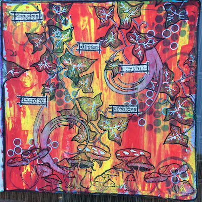 I have a journal page to share with you all today. I have been struggling, creatively for a bit, So I went back to basics I had learnt when I started art journaling. Keeping my background colours within the same colour family with a contrast colour over the top. I also stamped the words 'Play', 'experience' and 'learn' in the circles as that is what I constantly have to remind myself to do with my Craft/Art supplies.
