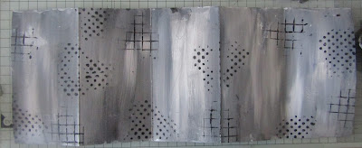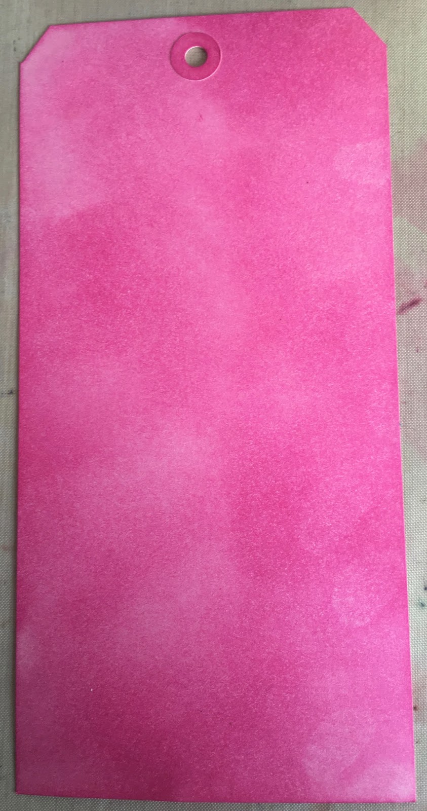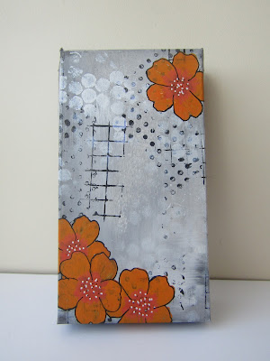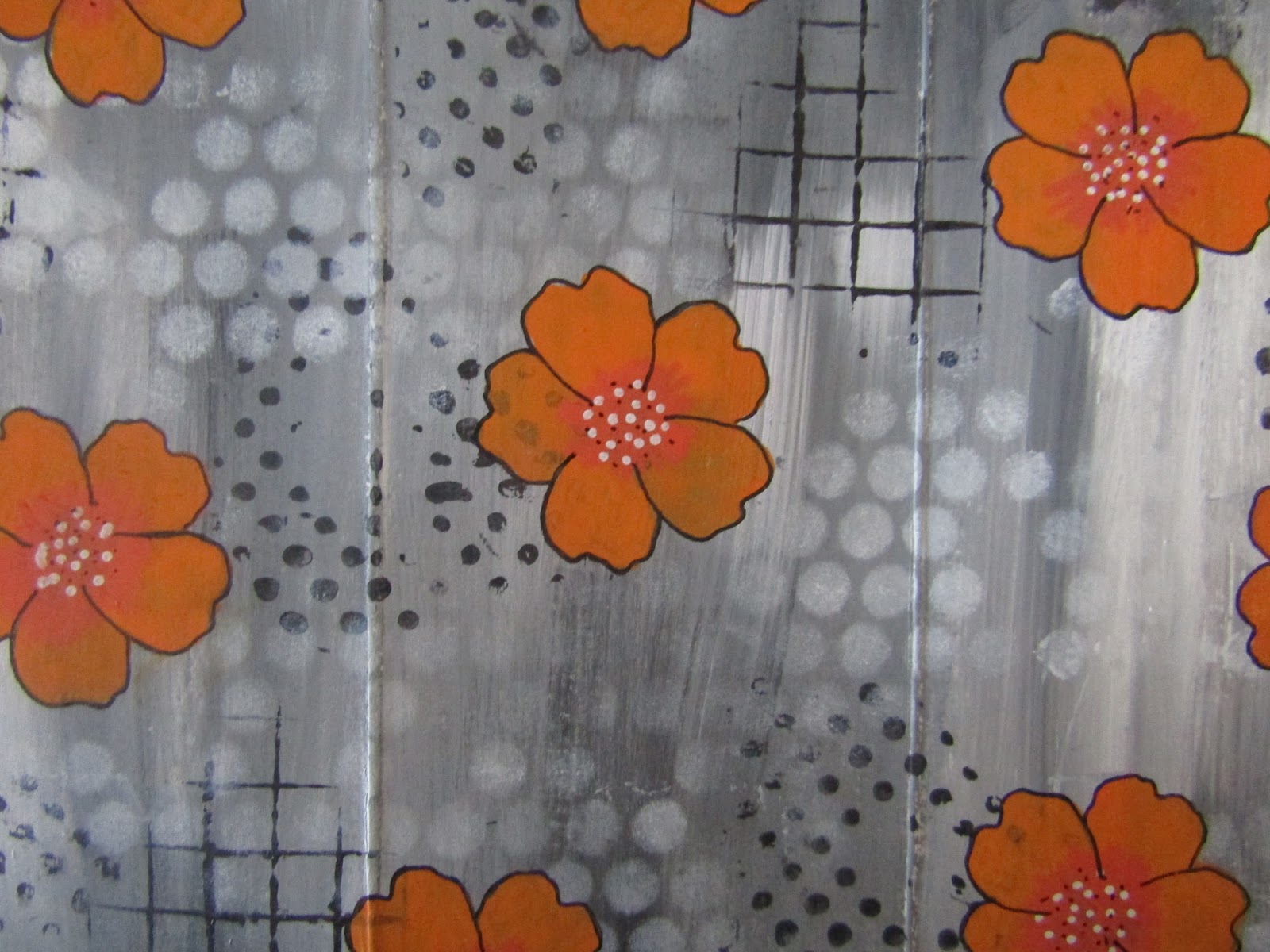 To start I added a small amount of white paint to some Dylusions Squeezed Orange and painted a layer over the card. I then placed three small amounts of the same paint onto my craft mat and added the tiniest amount of black paint to the first pile and an even tinnier amount to the second, the third I left as it was. With these paints I stamped the lace background over the card and sponged through the dot mask.