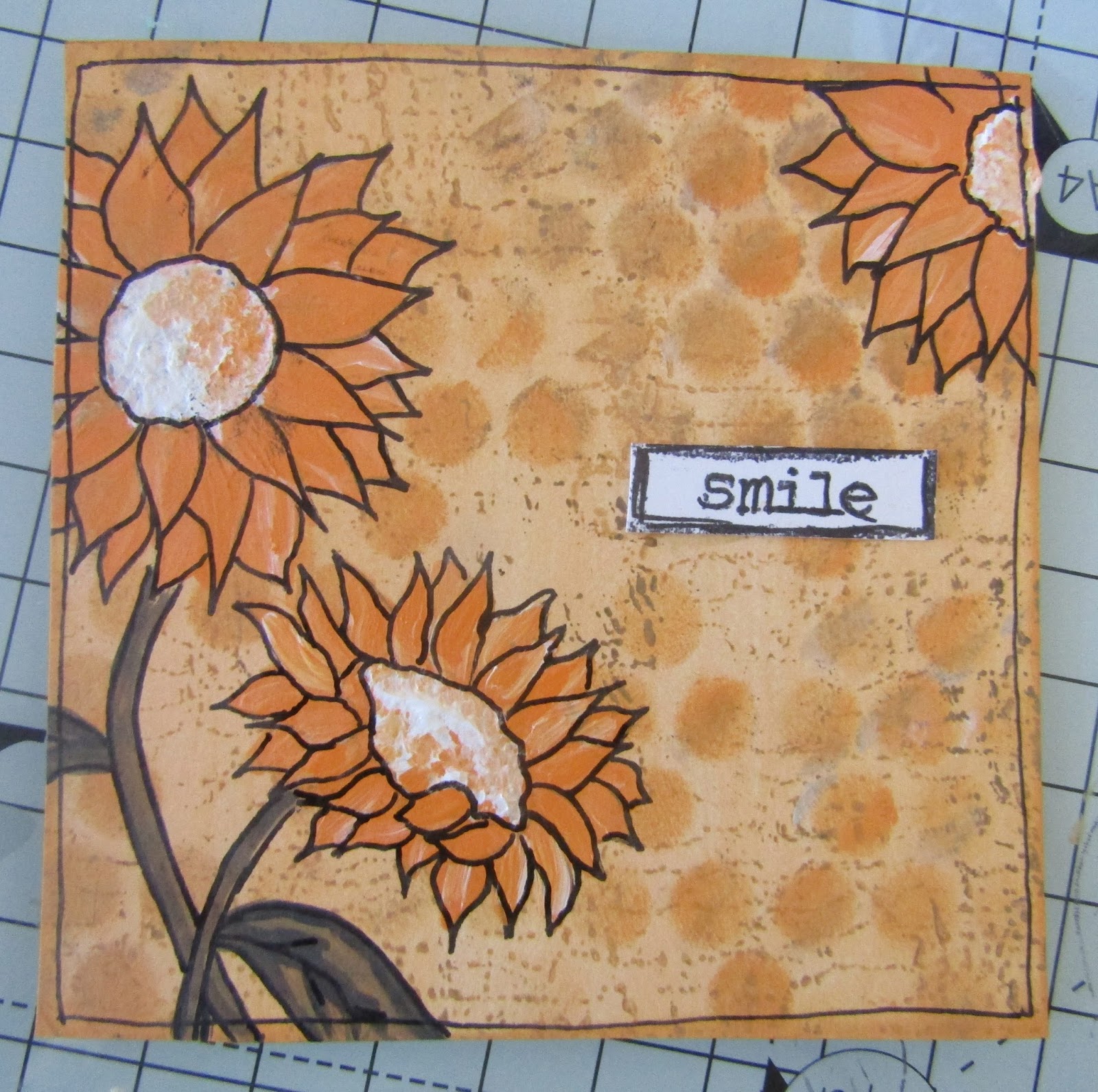 I added the word smile from the framed words set and painted the flowers in using a mixture of the three paints, Orange, Black and white. Once it was totally dry I went around everything with a black pen and drew a wonky frame around the edge before gluing it in place on the card blank.