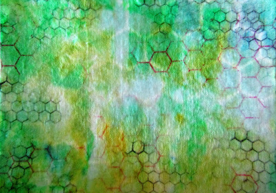 I then added some blue with a distress ink and the honeycomb mask. Over that, I stamped with different coloured distress ink, the honeycomb stamp and mini honeycomb stamp.