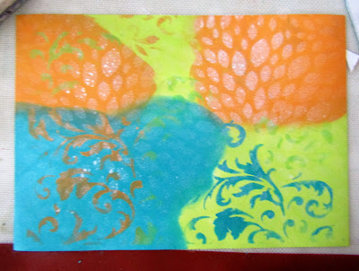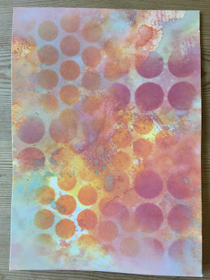 I then laid the Swirl mask over the top moving it around and sponging the same colours through it until I was happy. Once that layer was dry I laid the Petal mask over the top and sprayed white paint through it.