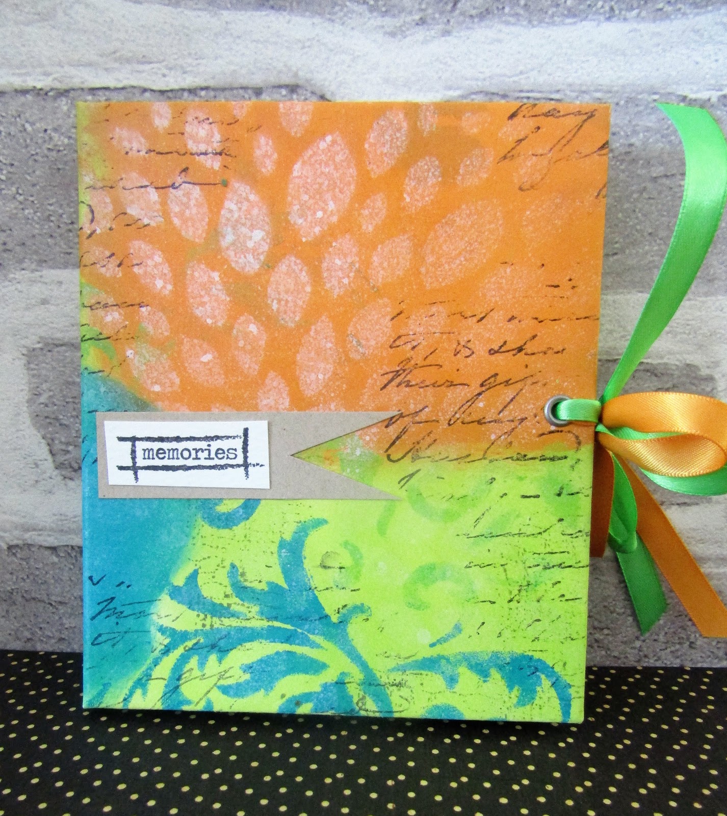 I cut chipboard to size for the front, back and spine of the book, glueing them into place onto the A3 sheet of card, before cutting the card down and folding over the sides. At this time I also punched holes into the covers so I could attach some ribbon as a closure.